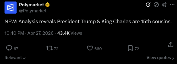 Trump is a king???https://x.com/Polymarket/status/2048955510624285145