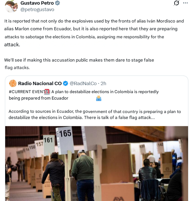 President of Colombia says a lot of explosives from ecuador would be used for falseflags in Colombia. Iran really fucked Narco Rubio neoconish plans for latin america that he might ragequit