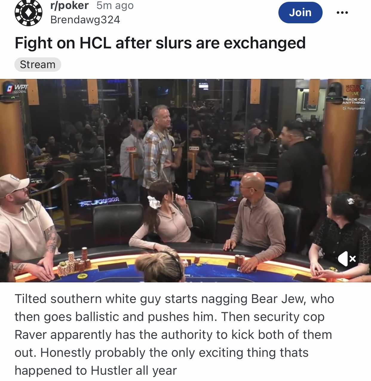 Major happening!!! Get in here!A guy who was introduced as a former marine got into an argument and called the player who goes by the name Bear Jew a jew to his face! https://www.reddit.com/r/poker/comments/1sxotpd/fight_on_hcl_after_slurs_are_exchanged/