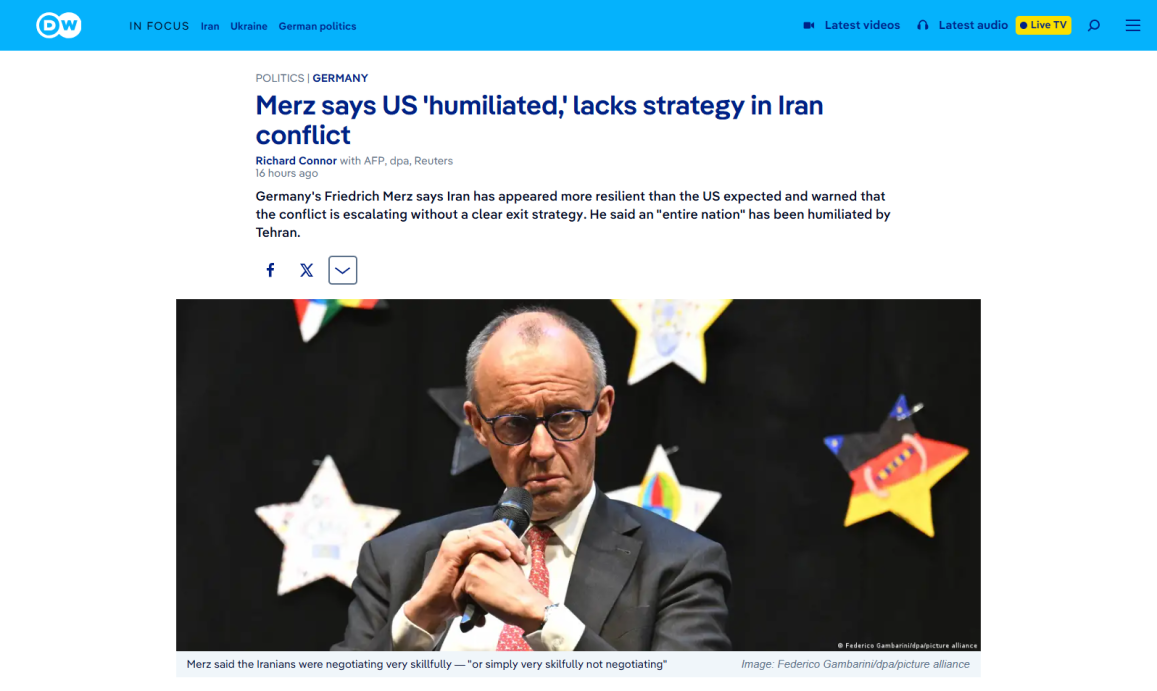 >>534024995>US Humiliated, lacks strength in the Iran conflict - MerzHe's doing the Israelis bidding, they both want to goad the US into escalation against Iran.I don't think there's any problem with Trump not acting for Israel to the detriment of the US.While not engaging directly, the EU have fully got behind "Operation economic fury" on behalf of Israel