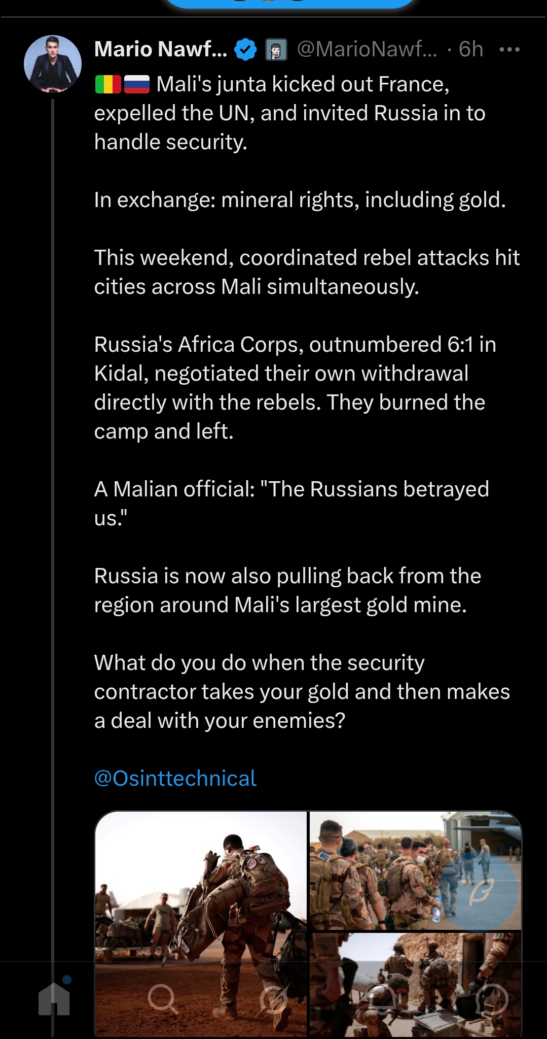 >534020674Wagner was outnumbered 6:1 - and what, they were supposed to just have a glorious last stand or some shit? Mali has a pathetically small army, something like 11k - and they have been dragging their feet growing it. At the end of the day Wagner is there to assist and train, not to fight their whole war for them. This is not good news for Russia’s agenda in Sahel, but there are limits to these things if the locals aren’t willing to fight jihadis themselves.