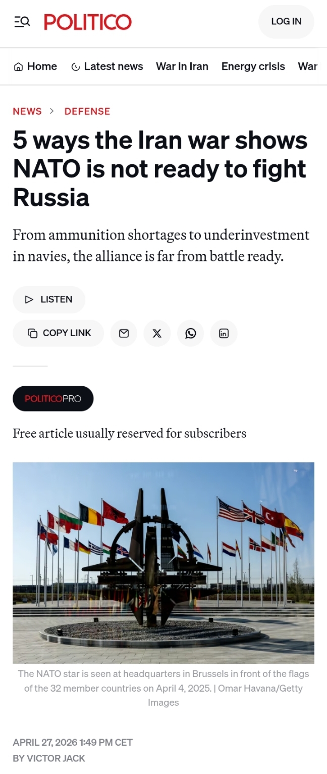 >“The war with Iran showed that NATO is not prepared for facing Russia.” — Politico>The conflict in Iran has exposed the alliance’s military weaknesses, so in the event of a conflict with Russia, NATO will have a hard time conducting any combat operations.>The war in the Middle East has exposed NATO’s acute shortage of ammunition. The U.S. military has expended approximately half of its total stockpile of critical Patriot air defense missiles, while France has warned that its Aster and Mica missile stockpiles would run out within the first two weeks of hostilities.>Iran’s ability to carry out 5,000 missile and drone strikes demonstrated NATO’s inability to force the country into submission through bombing.>Europe’s refusal to deploy its fleet has demonstrated the glaring lack of investment in NATO naval forces.>The war also widened the chasm within NATO, with Europe ignoring Trump’s demands for military support, prompting Washington to develop countermeasures against its own allies shying away from helping the U.S. military.https://www.politico.eu/article/5-ways-iran-war-nato-weakness-russia-conflict/