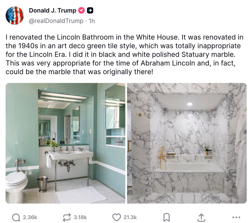 >>534026865>The Holy Lincoln Bathroom is sacrosanct!!!!! That was the one Lincoln added!>well I guess it became sacrosanct right after the 1940s gut job that tore out everything Lincoln added and replaced it with green 1940s art deco, which was fine>but now it's sacrosanct and how dare drumpf also gut it!!!!!You troons are hilarious