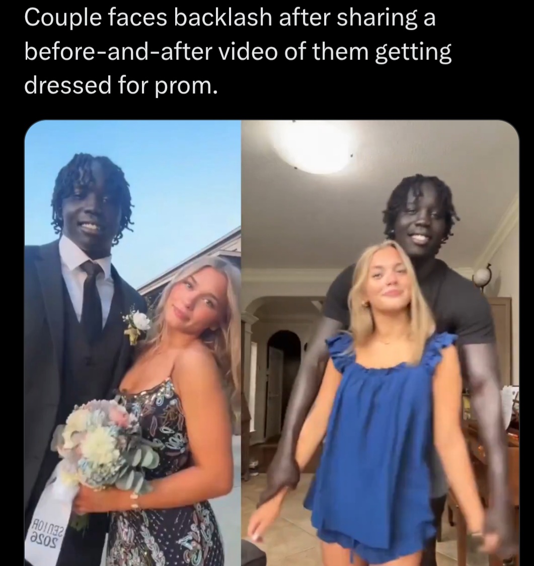 >This incident involves a couple who went viral after sharing a prom before-and-after video that quickly sparked backlash online. While some viewers found it entertaining, others criticized the transformation and questioned the message behind it. The clip has since divided opinions, turning a simple post into a heated debate about hate and racismWhy can"t you post a video like this in Trumps america without getting racially abused?