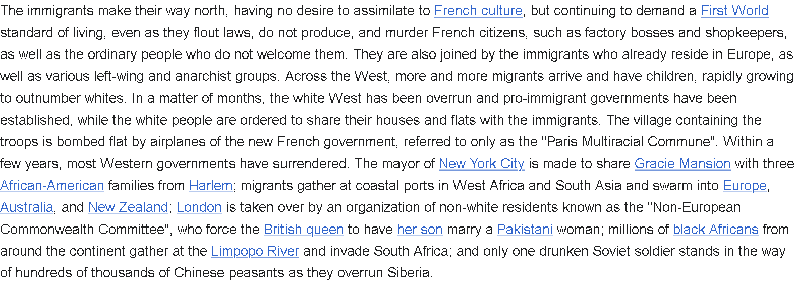 >>534026961I assume you mean >his other books He’s got a lotta other works that appear untranslated. I don’t remember him having such an extensive Wikipedia until recently. He’s a Catholic through and through, maybe that’s where he learned the Kalergi plan. The Catholic Church is a huge part of it.https://en.wikipedia.org/wiki/Jean_Raspail