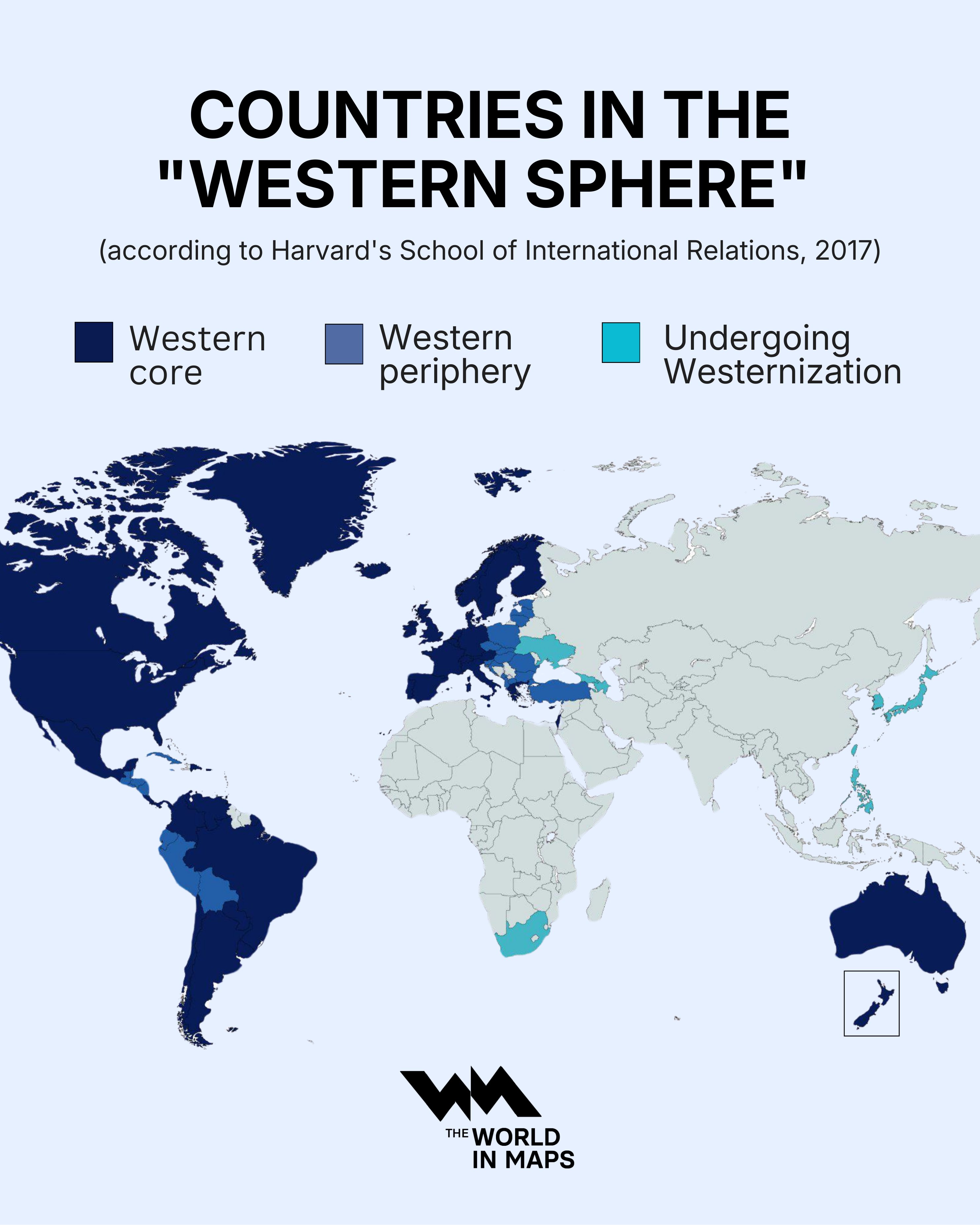 >>534027717All the light blue countries in Europe were part of the USSR, Greece like Portugal and Spain wasn't fully western style democratic until the 1970s but still part of the Western block.Most of SA has been fully capitalistic and culturally spanish since forever, also part of the Monroe Doctrine pol. implications.There are more sophisticated versions of this were Eastern European countries are also differentiated based on being culturally Orthodox vs Catholic, and Greece analogously lighter blue etc.Pic related was Huntington's classification