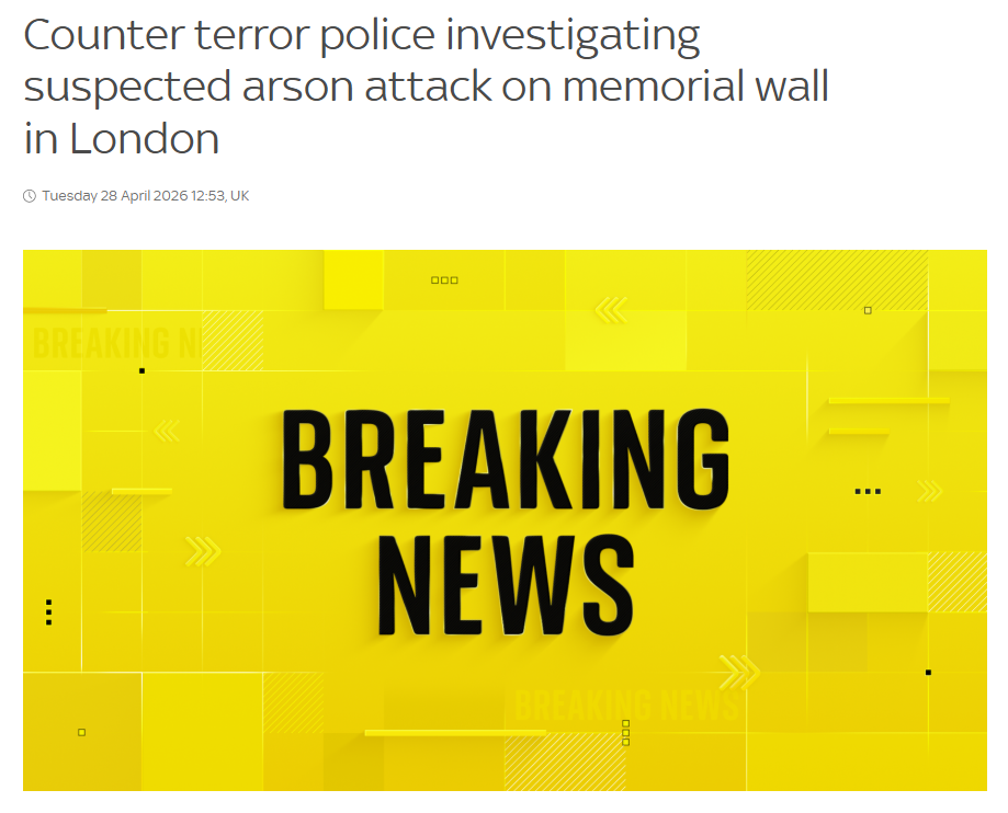 >https://news.sky.com/story/counter-terror-police-investigating-suspected-arson-attack-on-memorial-wall-in-london-13537468Hey Rabbi