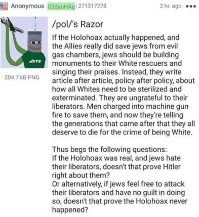>>534034213Where is our respect? We experience hateful, and usually illegal, antisemitism every single day.