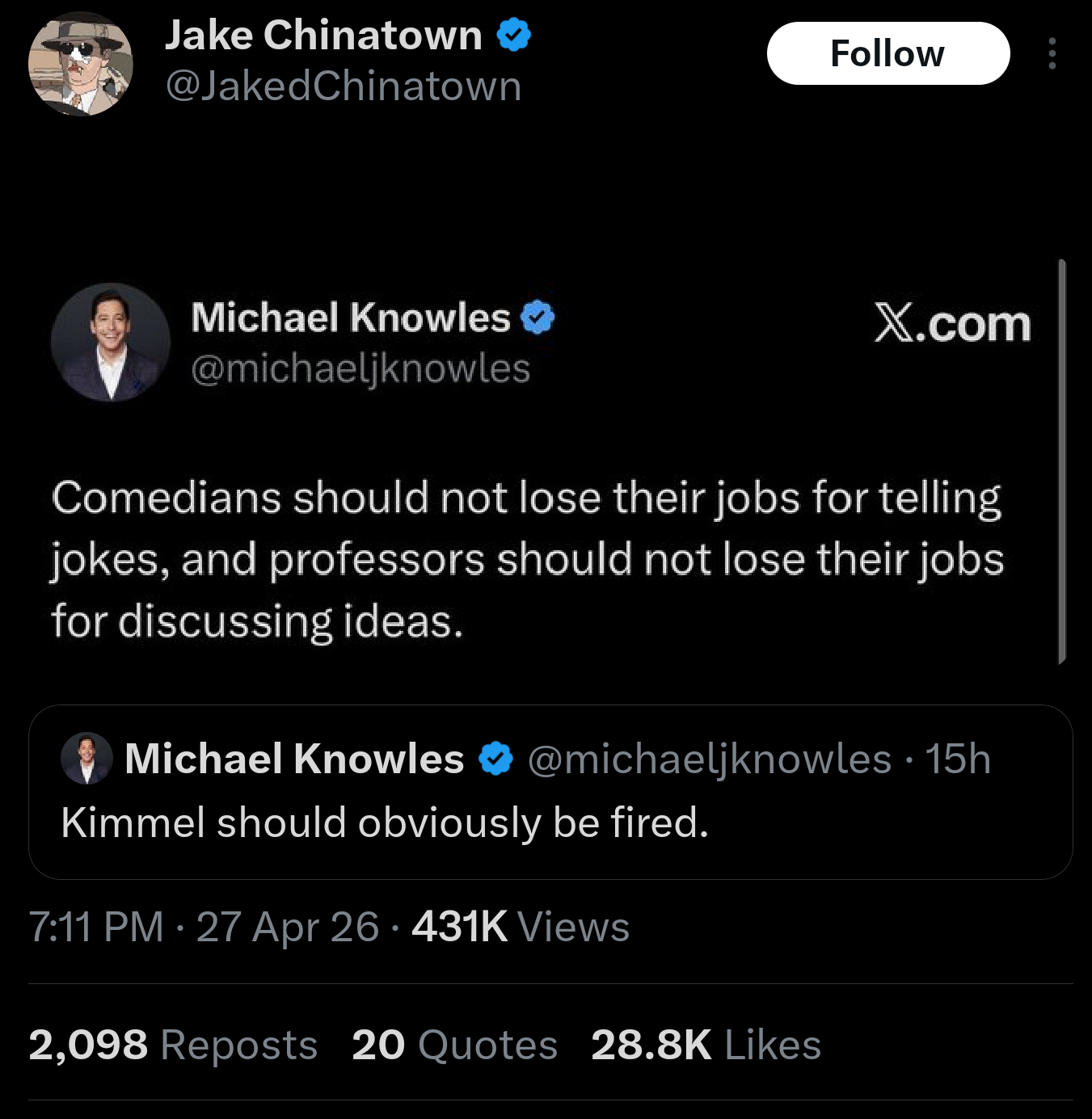 Kimmel’s comment was not a joke. Jokes are funny. Kimmel hasn’t been funny since Man Show, so he is not covered under the comedian clause of the statement.Checkmate, libtards!