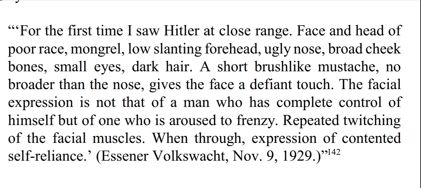 >>534041896>Face and head of poor race, mongrel, low slanting forehead, ugly nose, broad cheek bones, small eyes, dark hair>The facial expression is not of a man who has complete control of himself, but one of who is aroused to frenzyOh no no no