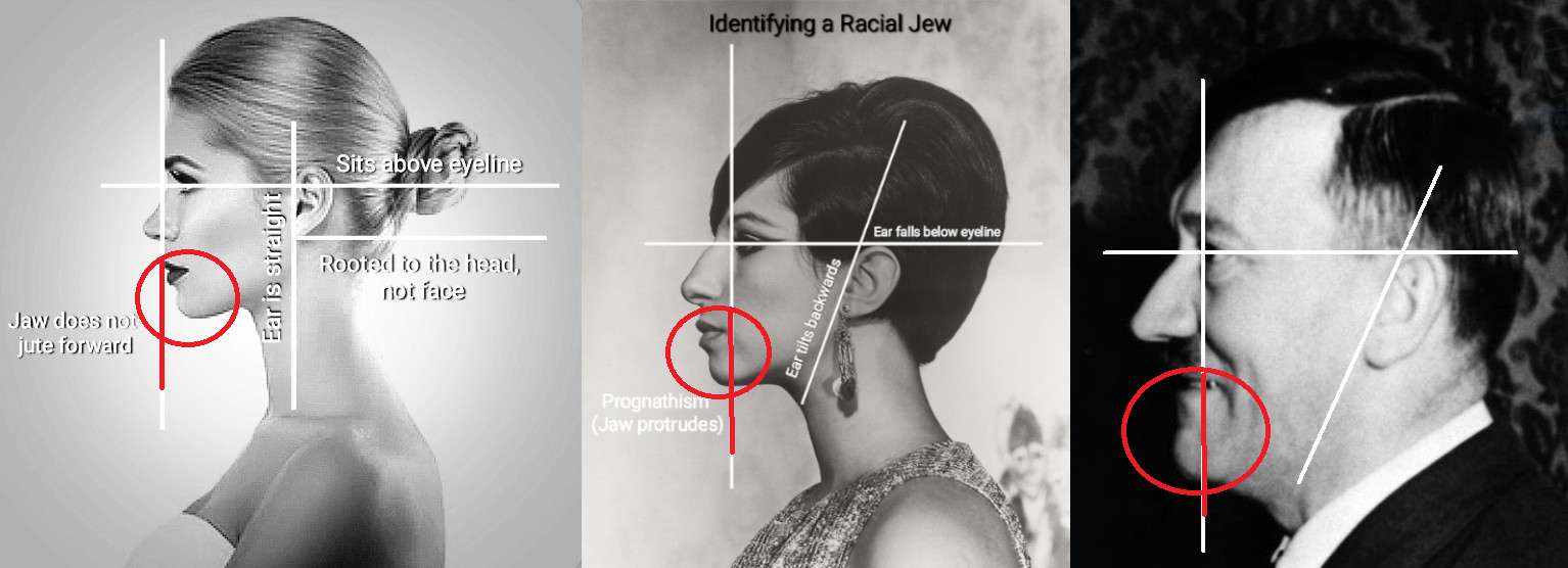 >>534047449Jews have their teeth and mouth extruded beyond the plane of the face, like niggers. This is obvious in the picture in OP. Hitler, as a European, has a flat mouth. Jews do not, they have 'frog lips' and orbital adipose tissue around the eyes, which Hitler doesnt have.