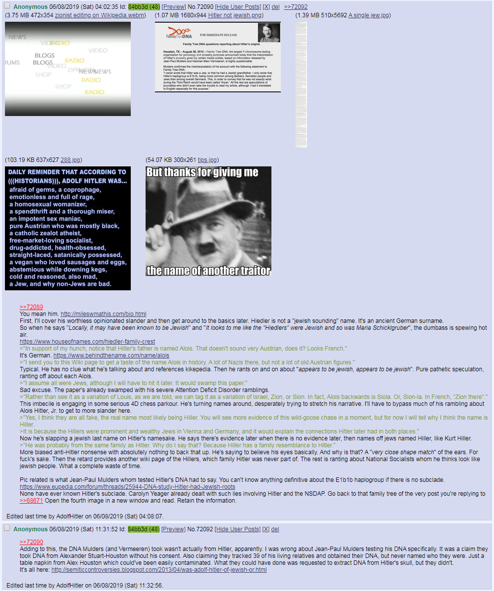 >>534041736>jew picking pennies for his shilling salary and push his communist fantasyhttps://jewishvirtuallibrary.org/was-hitler-jewish>This first direct genetic examination concludes unequivocally that Hitler’s ancestry was solely Austrian German, with no evidence of any Jewish heritage.suffocate in the air shelter chaim as you are to this day unable to convince anyone that any resistance towards jewish hegemony is jewish ploy