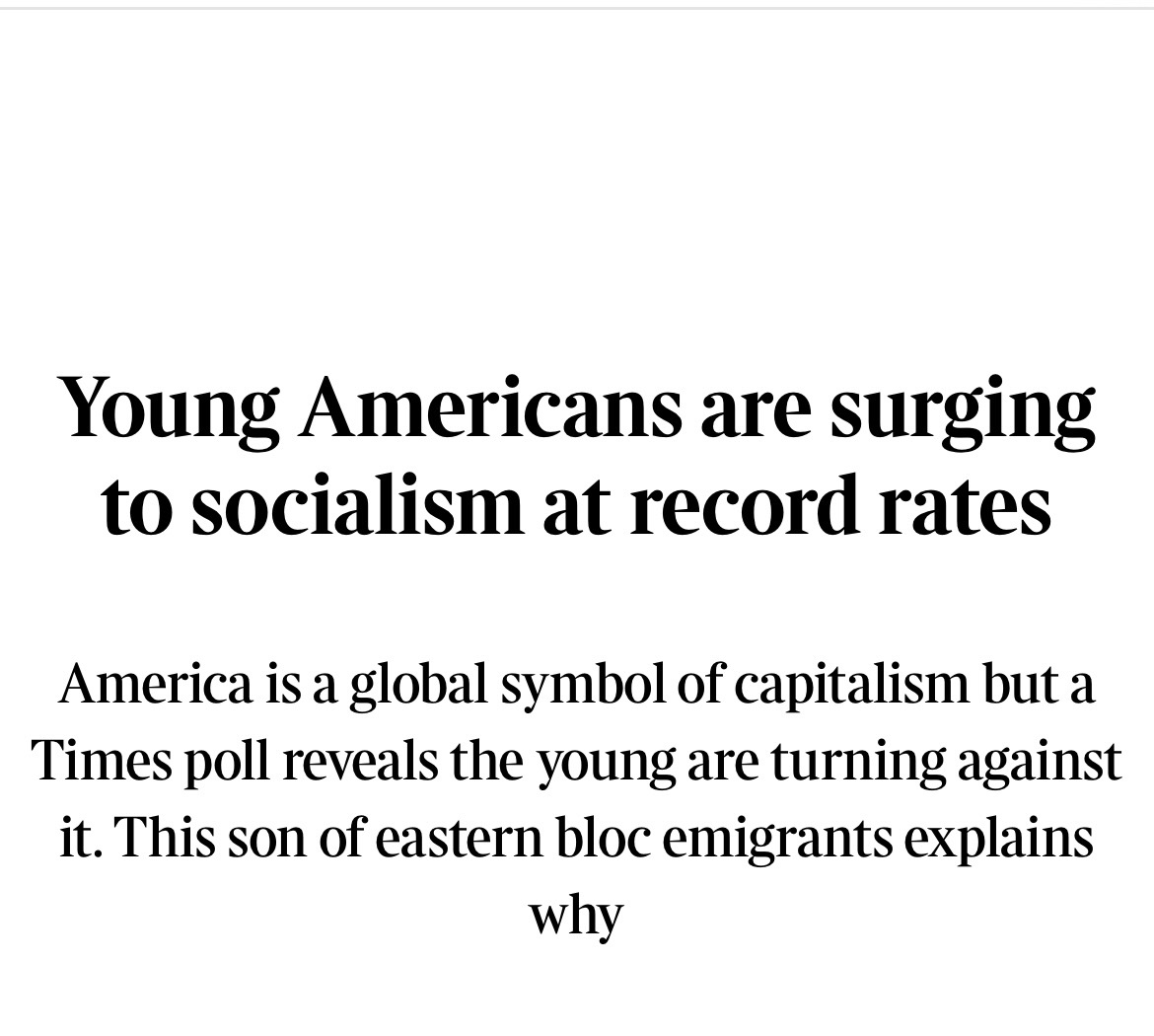 >>534051832>surging to socialismWeird phrasing.It might mean something if anyone could settle on what socialism actually is.As it is, it just means zoomers are whiny and want more freebees and associate their problems with "pedophile billionnaires" rather than an incompetent education system that deliberately broke them mentally and financially.
