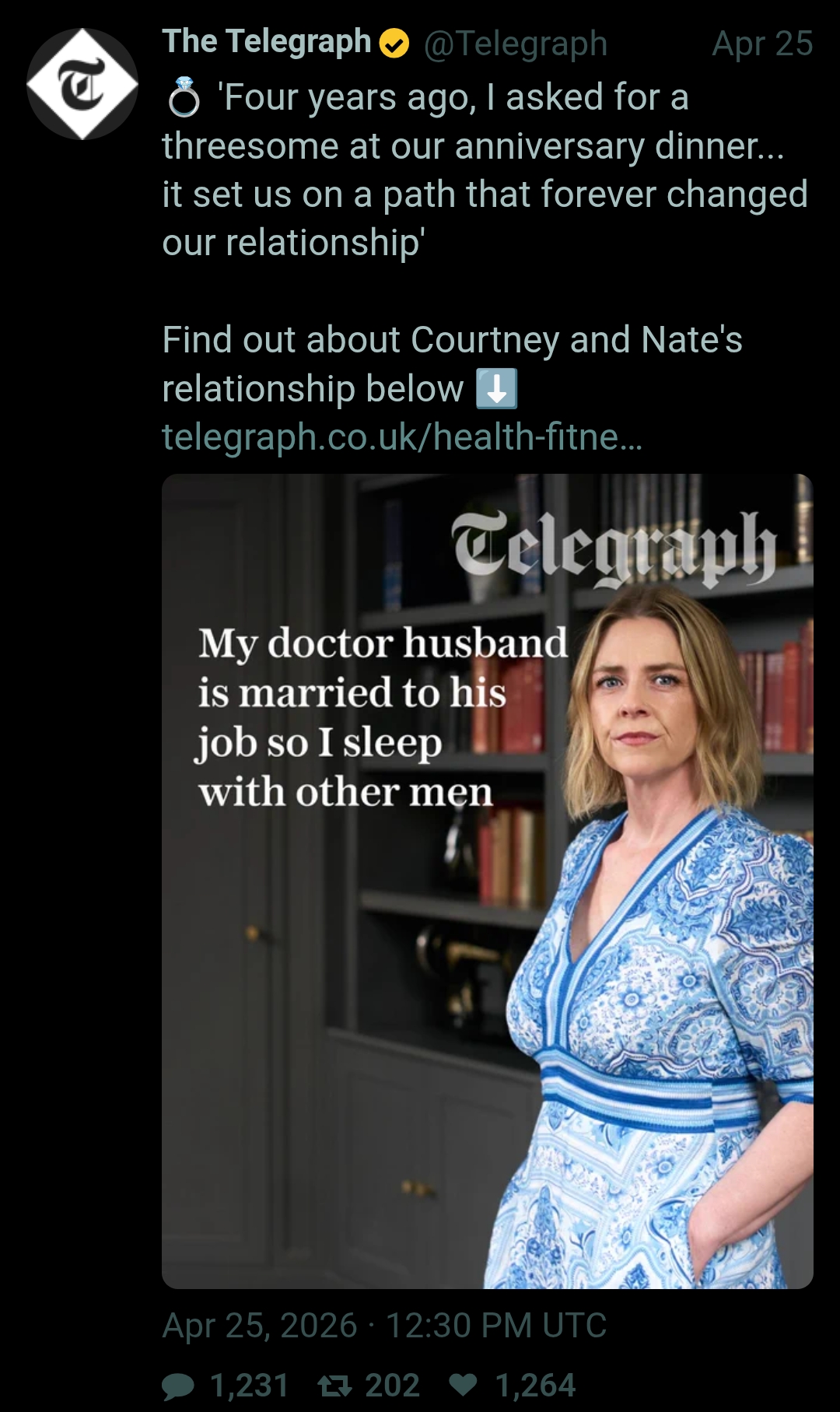 >Doctor marries law student, provides so much money they have 3 kids starting at 26 years old and live wherever she wants>Later she gets lonely from him working aboard and demands she fuck 5 guys at anniversary dinnerAre British people okay?