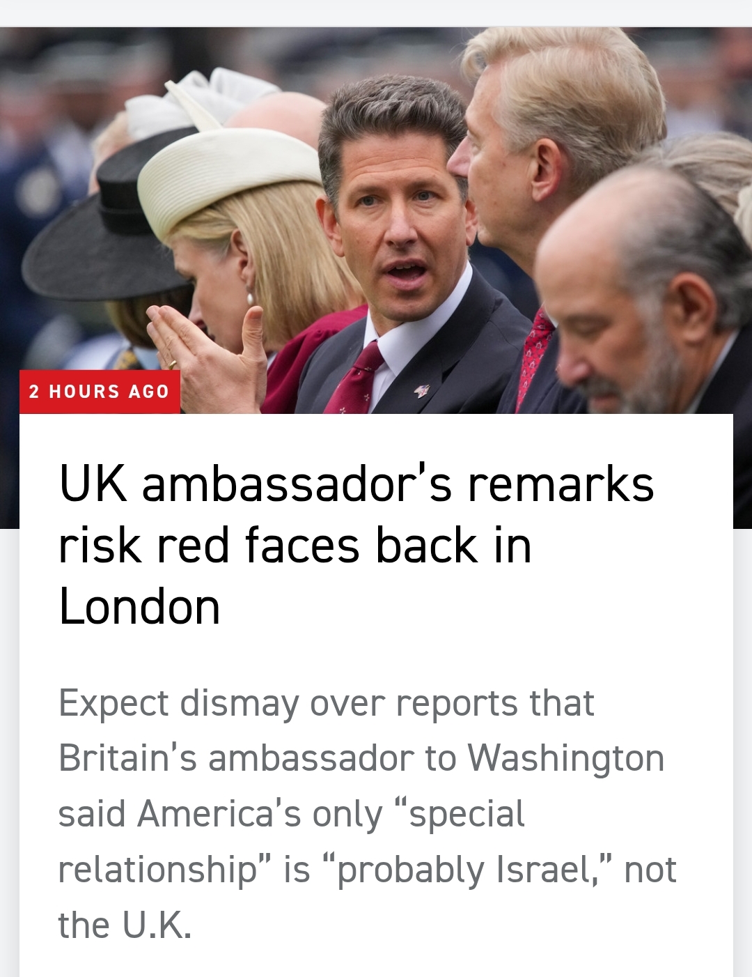 https://xcancel.com/PolitlcsUK/status/2049126865235800575#m> BREAKING: The new UK ambassador to the US, Christian Turner, privately said that the US "special relationship" is with Israel, not the UK>The leak risks overshadowing the King's state visit >A Government spokesperson said: "These were private, informal comments made to a group of UK sixth-form students visiting the US in early February. They are certainly not any reflection of the UK government’s position" Well, he's going to be sacked lmao