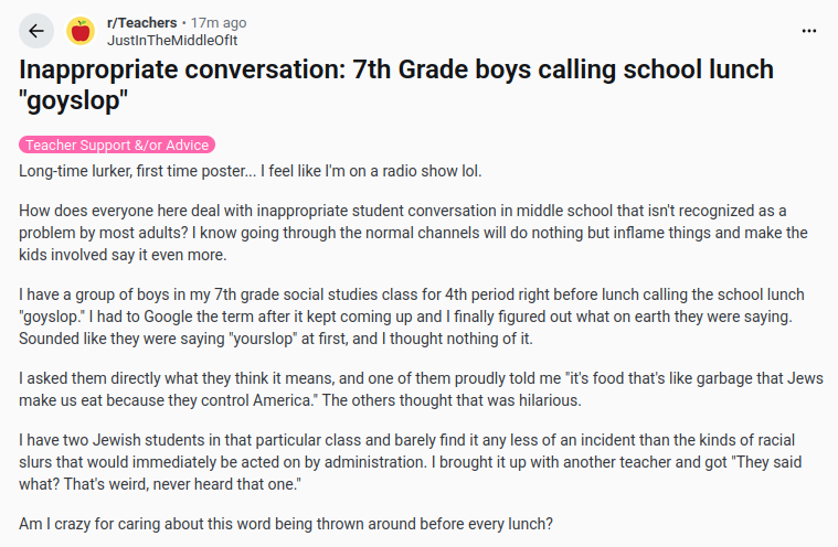 >>534054031I visit that subreddit from time to time to laugh at (millennial and up) teachers being butthurt because their pupils aren't brainwashed zogbots like they are and always have been.