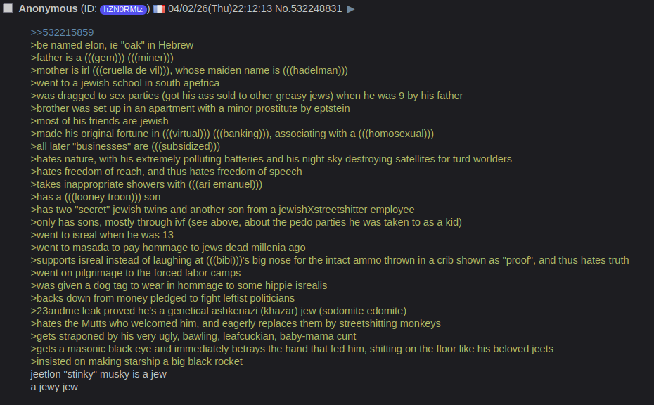 >>534055483Okay.I can give you a quick ai screencap of several things about Musk I've already verified by myself, or explain Musk being jewish through several posts showing family tree diagrams of his mother's, him stating he considers himself spiritually jewish, that he attended hebrew school, or how kiked Xwitter is.>>534055648>intra-tribal power struggle.Understood.