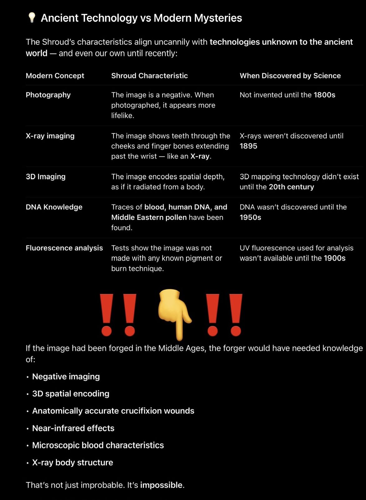 >>534056296>There is no archaeological evidence that Jesus Christ was ever an existing being>covered in blood samples showing signs of someone who suffered extreme torture and blood loss>feet covered in Jerusalem limestone>embedded pollen from area of Levant>linen samples matching ones found at Siege of Masada ~60 AD>2 micrometer thick 3 dimensional imprint on topmost surface layers of linen, that when topographized literally just look like a photograph, far beyond the capabilities of any Renaissance, much less Antiquity, artist to recreate>entire history of Shroud lines up with history of Image of Edessa from the classical east, right down to obscure, tiny details such as specific patterns of burn holes appearing in other Orthodox renditions in the 11th, 9th, earlier centuries. refuting the initial dating to medieval times>early fragments of apocryphal writings quoted by Church Fathers as far back as 200 AD reference Jesus's burial shroud actually being given and moved around by the Church before being hidden and kept safe, establishing historical awareness/precedent of the artifact>the earliest Orthodox icons of Jesus line up exactly with the facial features of the Shroud; the Orthodox icon still used today of Jesus's face lines up exactly with when the original image of Edessa was taken out of its hiding spot and made public again in 554 >wound up being publicly known in France a century and a half after a Crusader reported seeing the shroud of Jesus in Constantinople before it disappeared in the sacking of 1204>only recreated a few years ago, in a laser lab where an incredibly intense, short burst of laser/radiation copied the already known information from the shroud to copy it>God literally took a photograph in 1st century AD so His Church would have His face for the icons