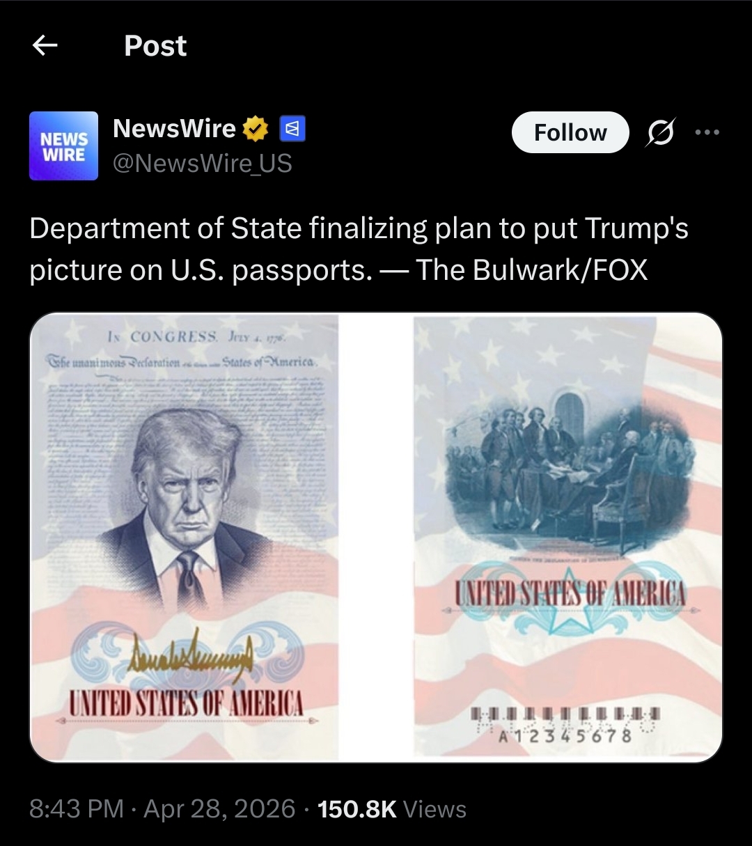 >>534057849>commemorative passports for the country's 250th anniversaryhttps://www.businessinsider.com/donald-trump-face-us-passports-250-anniversary-2026-4I'm tired of Satanist half lies.