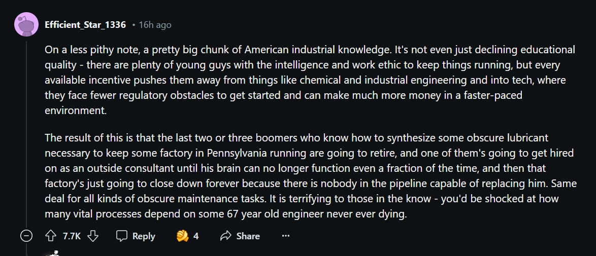 >>534066706There is this one local factory where my friend's boomer dad is the only person who can maintain a large fraction of their machines. Once he retires next year, they'll have to replace all of them and eat a couple hundred grand in losses (tbf those machines are sorta obsolete, but you get the point)This boomer retirement stuff is not a meme. Russia's entire oil and gas infrastructure hinges on 60+ year old boomer engineers who were trained back in the Brezhnev era. Russia has been too retarded to train new petroleum engineers in sufficient quantities ever since
