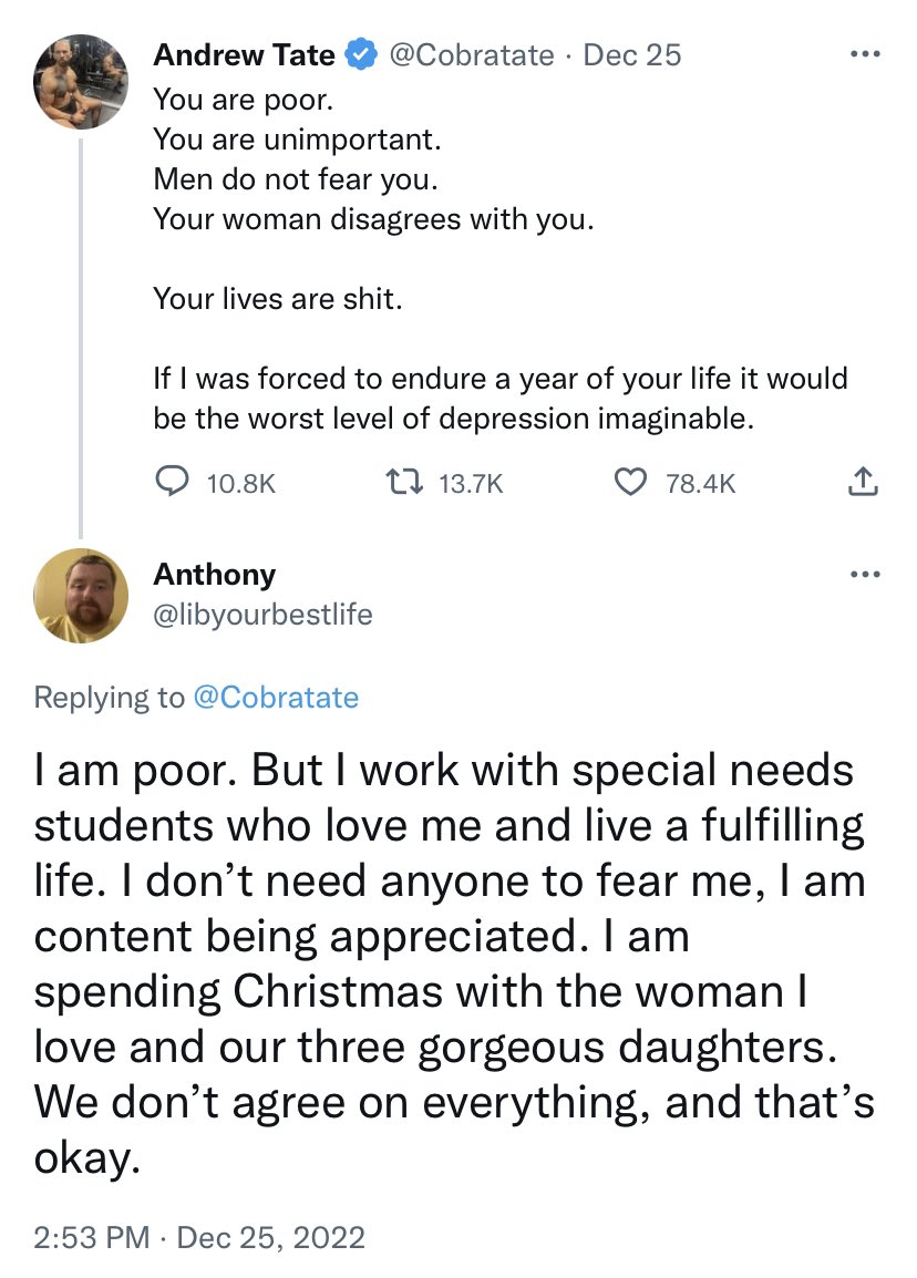 Anthony, being rich and having status means nothing if you're spiritually dead inside, if Tate dies tomorrow, all those worldy accolades and material riches would be in vain