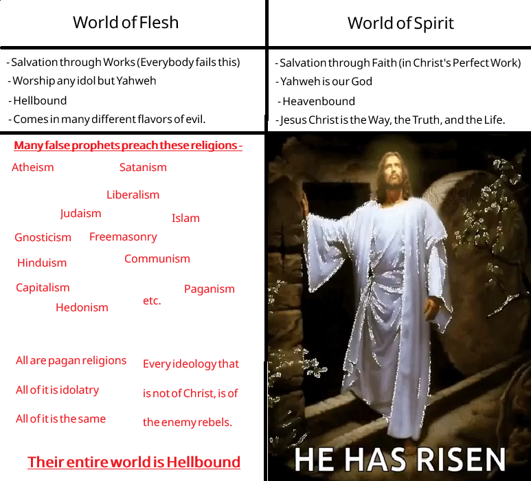 >>534071107Throwing a temper tantrum at our Heavenly Father isn't going to help you at all.>>534071242The world belongs to Christ and His followers, everyone else is heading down self-destructive paths.>>534071369Paganism loses after all, no foundation + illogical/irrational.>>534071408Incorrect, you are all paganists, you are all the same. Only Christians are different. There is no difference between "left" & "right" to the non-Christian.