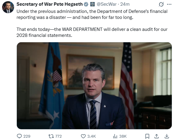 Hegseth wants a clean audit of the Pentagon in 2028https://x.com/SecWar/status/2049259754178965829
