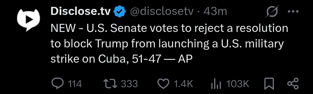 >NEW - U.S. Senate votes to reject a resolution to block Trump from launching a U.S. military strike on Cuba, 51-47 — AP