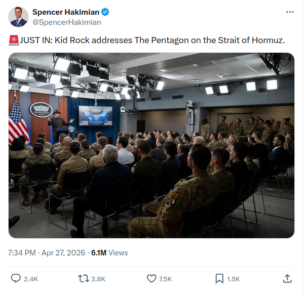 BasedPete Hegseth is just out there living his best life. Getting an apache to go pick up Kid Rock so they can do coke and take shots while flying circles over DC, then having Rock give a presentation to the join chiefs of staff on how bad ass it was to have a threesome with Sheryl Crow and Jamie Kinghttps://x.com/SpencerHakimian/status/2048953886078038466/photo/1>>534077078I think JP2 is a pretty cool guy. Eh kills communism and doesn't afraid of anything