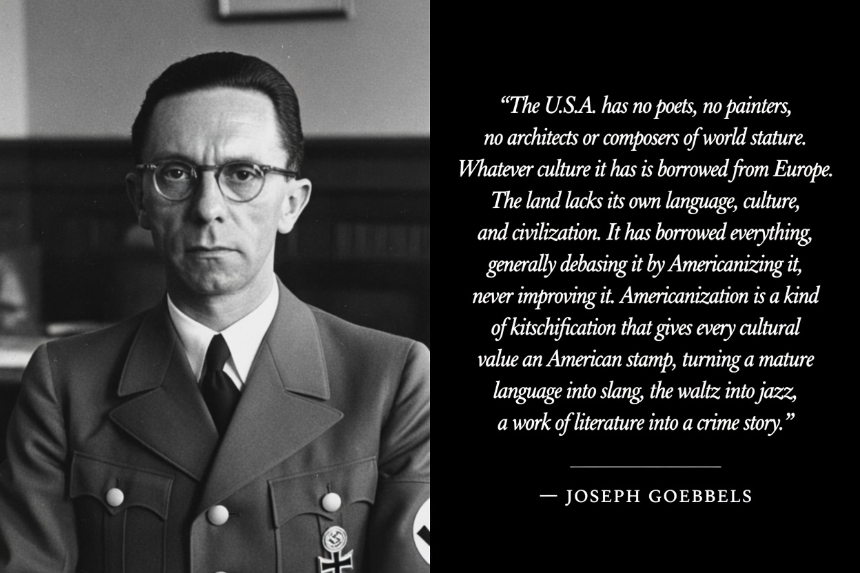 >One is never sure which of two characteristics is more prominent in the American national character and therefore of the greater significance: naivete or a superiority complex. When for example they say things about our region, our surprise at their ignorance is surpassed only by annoyance at their stupid insolence. The less they know about a matter, the more confidently they speak. They really believe that Europeans are eagerly waiting to hear from them and heed their advice. They took our strategic decision not to discuss their shallow culture before the war as a sign of admiration. Their greatest technical accomplishments are refrigerators and radios. They cannot believe that there are cultural values that are the result of centuries of historical development, which cannot simply be bought. It was no bad joke when, after the war, they bought the ruins of German castles and moved them stone by stone to the U.S.A. They really thought that they had purchased a piece of national history embodied in stone, and were naive enough to think that mocking laughter from Europe was respect for the wealth that enabled them to buy what their own tradition and culture lacked.