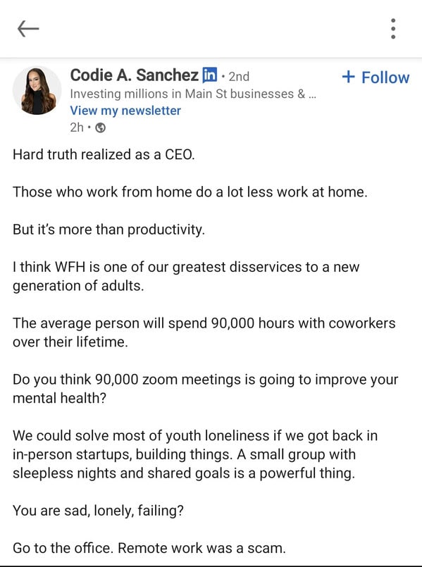 >>534079108>Commute an hour to the office through soul crushing traffic>Spend most of your day on zoom callsI've watched her videos on YouTube. She doesn't know shit about anything technical but keeps talking about technical things and even gives out advice. Completely manufactured girl boss millionaire.