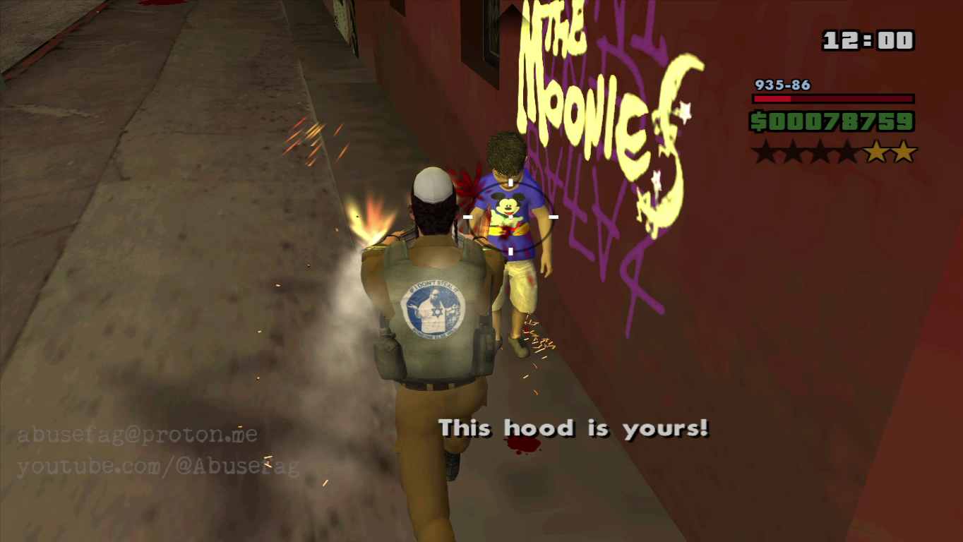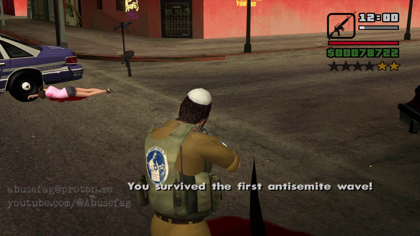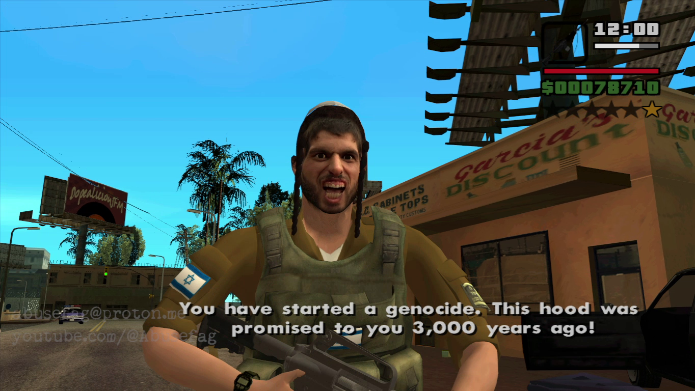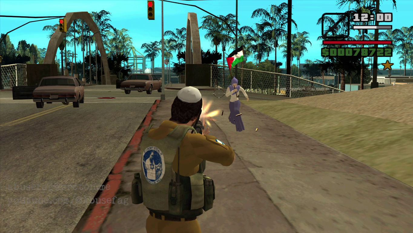 Grand Thef Auto: San Andreas (2004) had a game mode called "gang wars" where you must conquer L.A hoods by surviving 3 waves of enemies with guns. Pic related is a mod I'm working on based on this game mode and it's called "GREAT ISRAEL SIMULATOR". On this satiric mod you play as that Israeli settler photographed by Pietro Masturzo for L'Espresso magazine. The vanilla game has 2 enemy gangs to conquer: Ballas and Vagos, so I have remplaced the first group for Palestinian women and children, and the latest group for Lebanese christians women and children. Both groups will only throw rocks at you without harm you(just like in real life), so your mission is start a genocide at each hood until conquer all the territories in order to achive the 'great israel'