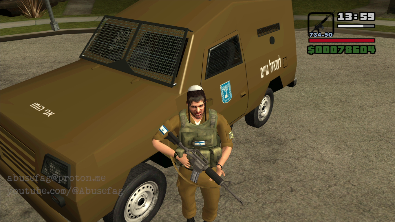 >>534082825You know you are not supposed to enjoy this, right?Also I'm working on other mod where you must kill IDF soldiers(it remplace the vanilla enemy skins for this jew settler skin). I have even made a vehicle for this faction. I used google translate so you tell me if it was correctly translated.