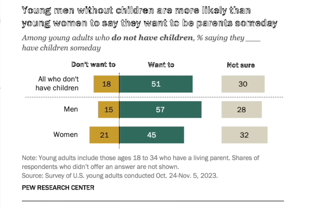 >>534085446>>534085786Question:>What percentage of young women, aged 18-34 in USA, do not want children?What we must find out:>The share of childless women aged 18-34 in USAextrapolated from pic related and census data from next pic related>The desire of childlessness in child-having women aged 18-34 in USAassumed to be close to 0>The desire of childlessness in childless women aged 18-34 in USA21% per OP's pic