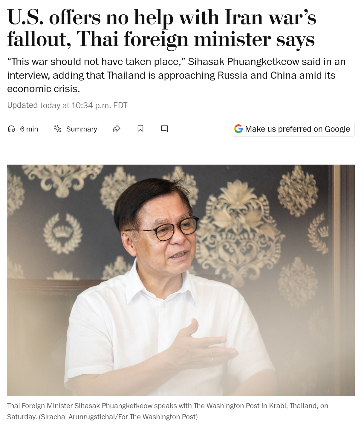 >The Trump administration has not offered any direct help to Thailand, a long-standing U.S. treaty ally, as it struggles with the wide-ranging economic damage from the American-Israeli war against Iran, Thailand’s foreign minister, Sihasak Phuangketkeow, said in an interview with The Washington Post.