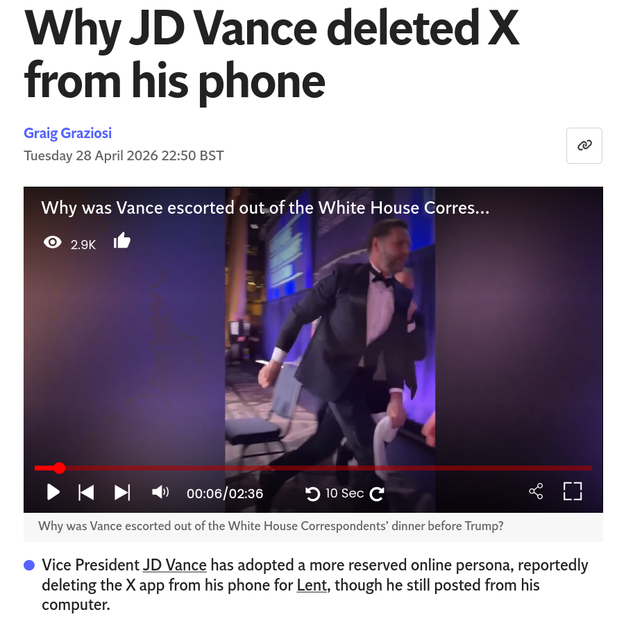 https://www.independent.co.uk/news/world/americas/us-politics/jd-vance-deletes-x-phone-b2966575.htmlSemafor Editor-in-Chief Ben Smith wrote in an op-ed that he'd spoken to two people close to Vance who confirmed the vice president deleted the X app from his phone for Lent. However, Vance did post on X between February 18 and April 2, so his social media fast seemingly allowed him to post from his computer.In any case, Lent is over and Vance hasn't broadly reverted to posting controversial comments, at least not on X.According to Smith, Vance's allies aren't sure what has driven the sudden shift in his famously provocative online persona.The vice president may be keeping a lower profile ahead of his new book launch in June. Vance is releasing his new book, Communion: Finding My Way Back to Faith, on June 16. The book's publisher, HarperCollins, describes it as "an intimate account of why he strayed from the Christianity of his youth and what led him back to faith."Vance's ambitions post-Trump may also be coloring his new, toned down social media presence.The 41-year-old is widely assumed to be the frontrunner to be the Republican presidential candidate in 2028. With midterms quickly approaching, Vance has approximately another year before he has to get serious about undertaking a presidential campaign, but he may be feeling the pressure to get started early as his current polling leaves room for improvement.
