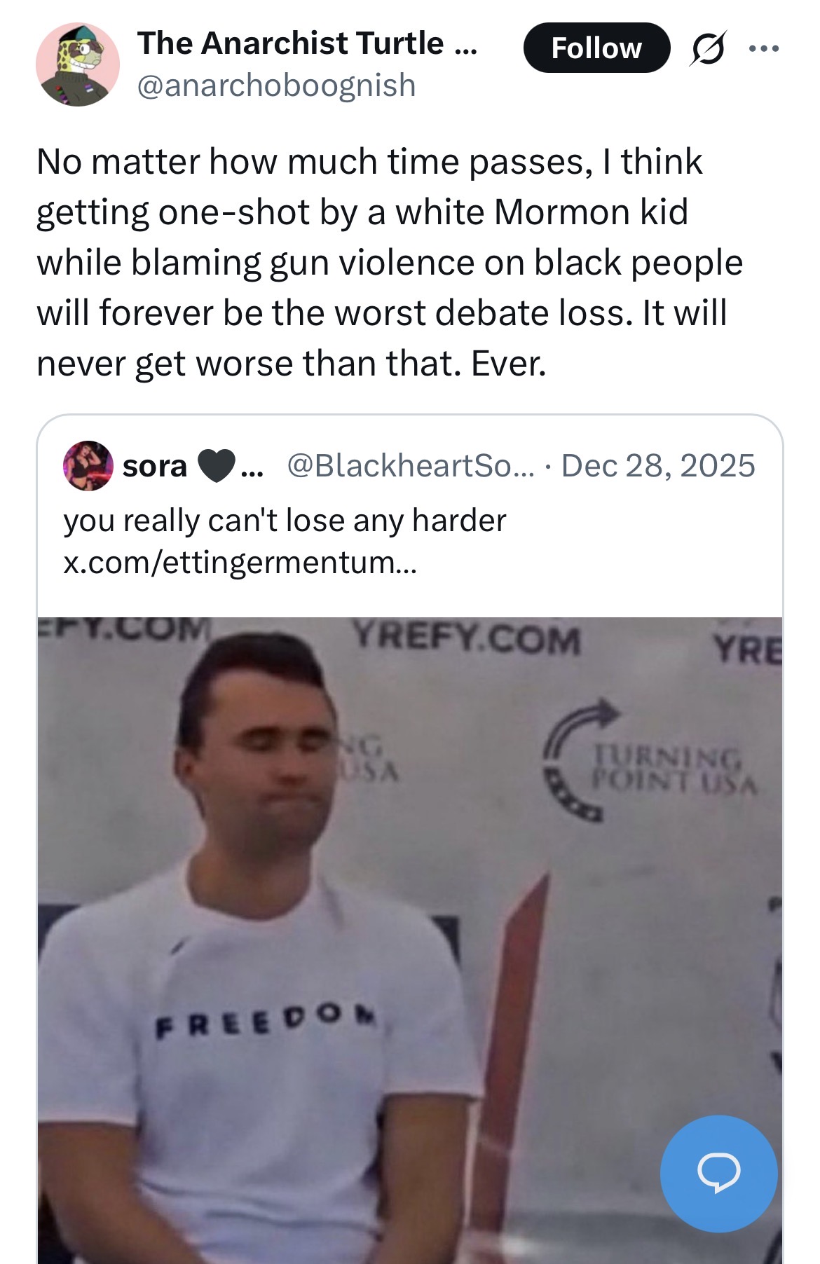 >>534094632>There isn't any argument to be had about this, Charlie was stating a fact, that's it.Yea leftists still haven't argued this, their literally only response is to kill you based on how right you are. Charlie was irrefutable so he had to be killed.