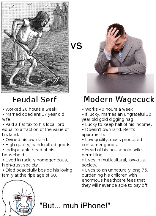 >>534092974>Feudal Serfhe did roughly the same hours but from home, which is why productivity jumped when people went WFH because it was more like how people worked prior to the industrial revolution.he also didn't own the land, but it was his to work, he was expected to pay his tax in either money from last years harvest if this hadn't been a good year or grain from this years harvest if it had been a good harvest.hygiene wasn't the best, soap was only used for laundry, laundry day was wash day, only the rich had candles, everyone else had oil which they soaked reeds in to burn.disease was caused by witches.people still had children because they had to as chances are half of them would die, yet they could afford to have and feed them.