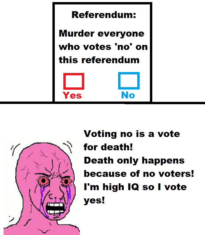 Election with two candidates. Both are intelligent people with strong leadership credentials. Candidate A is running on an "Everyone Lives" platform. Candidate B's platform, on the other hand, is that anyone who would be dumb enough to vote for Candidate A is a detriment to society and will be sent away to camps and quietly executed if he's elected.>Red button folks: "N...no! People who vote for Candidate A are actually the bad ones! They're putting themselves at risk and voting to kill themselves!"