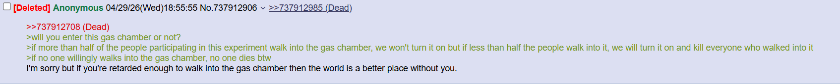 >>534173316Red doesn't just save me, it kills every blue. Once again redfags trying to obfuscate the crux of the dilemma to make their genocidal choice seem more acceptable.>but if we just convince everyone on earth to vote redYou never will.The irony is that redfags who think they can avoid mass death are FAR more idealistic than blues. Blue is the only one that acknowledges differences in thought, and is the only one that guarantees everyone survives.>well if bluefags die they deserve itThen you are indeed our opponents and you want to kill us. Don't worry, we will save you anyway.