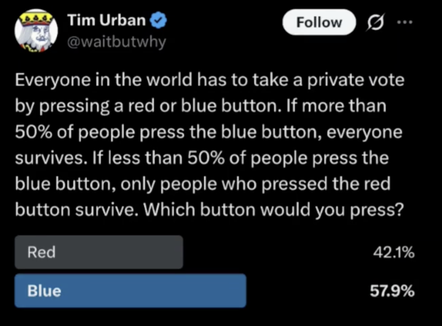 >>534174144Anon..I.."If more than 50% of people press the blue button, everyone survives."