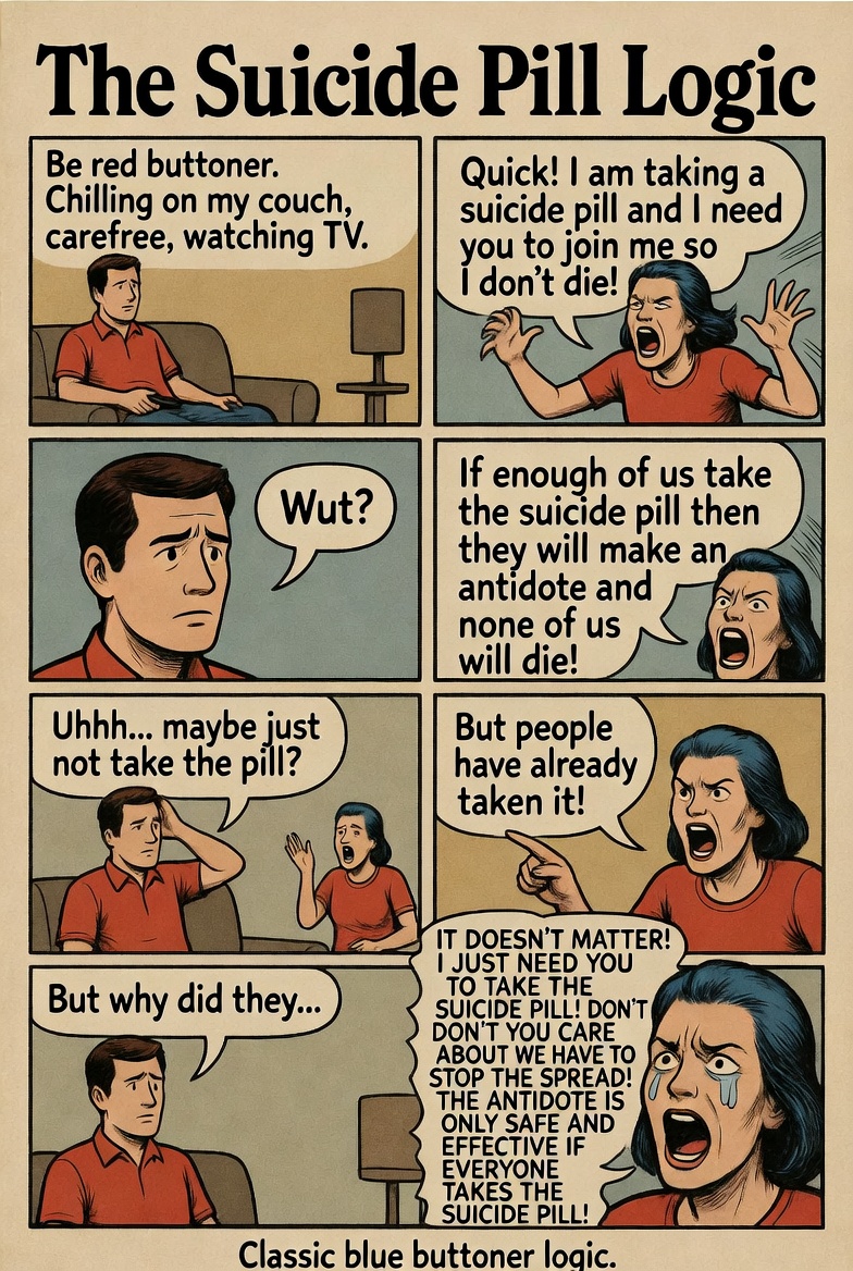>chance of death by pushing red: 0>chance of death by pushing blue: higher than 0bluefags joined a suicide pact and are desperate to get other retards to join them now that the implications are (more) clear, simple as that