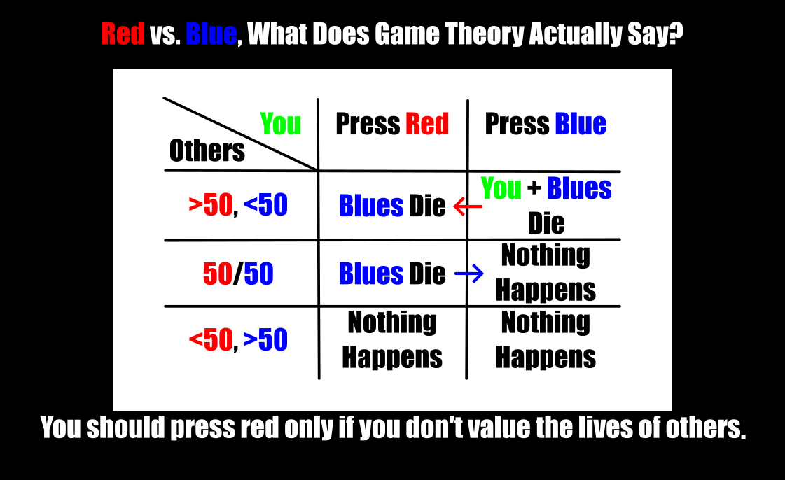 >>534167450Wouldn't everyone just press red? Blue is just risking your life for no reason