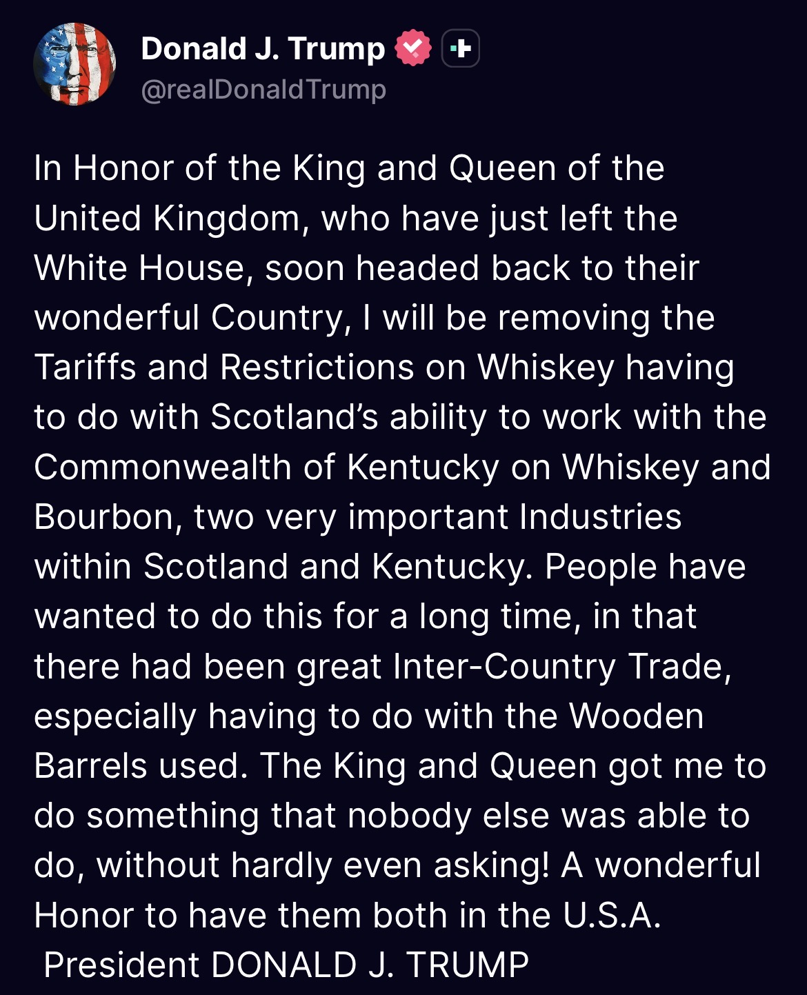 >tweetIn Honor of the King and Queen of the United Kingdom, who have just left the White House, soon headed back to their wonderful Country, I will be removing the Tariffs and Restrictions on Whiskey having to do with Scotland’s ability to work with the Commonwealth of Kentucky on Whiskey and Bourbon, two very important Industries within Scotland and Kentucky. People have wanted to do this for a long time, in that there had been great Inter-Country Trade, especially having to do with the Wooden Barrels used. The King and Queen got me to do something that nobody else was able to do, without hardly even asking! A wonderful Honor to have them both in the U.S.A. President DONALD J. TRUMP