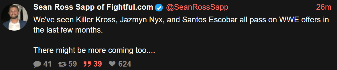 >>18986363This. He's eagerly trying to make it sound like some major tide shifting thing where big names are leaving. Meanwhile it's just Karrion Kross who grossly overestimated his value outside of WWE, Jazmyn Nyx who was a developmental NIL hire and never even cared about wrestling, and now Santos Escobar who's amounted to jack shit across his entire WWE run