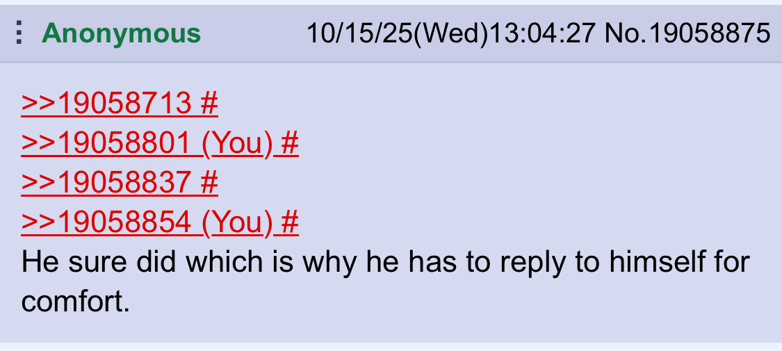 >>19058713>>19058801>>19058837>>19058854He sure did which is why he has to reply to himself for comfort.