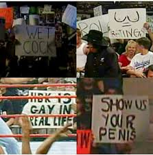 >>19070793It was like that back in the day. I attended In Your House 6 in Louisville in 1996, and I brought two signs that were confiscated. The first one just said "Goldust is a faggot". It was confiscated on the way in. Second one was a reference to these two local radio guys. Every time WWF did a show at the Louisville Gardens, they would have these two local radio DJs doing this cringey untelevised opening act where they attempted to wrestle. badly. So I made a big banner sign that said "FUCK THESE RADIO FAGS". This one was folded up so they didn't take it lol. So, when the faggot radio guys came in, I whipped out the sign and passed one end down the aisle for another guy to hold. And would you believe, these two radio fags got so mad that they confronted me (a 12-year old kid) after the show and I proceeded to humiliate them both with a terrible roasting, telling them that nobody wanted to see their gay asses pretending to wrestle and that they should fuck off back to whatever gay bar they crawled out from. It was awesome to see these two faggots slink away in defeat after thinking they could intimidate some kid in the crowd over a sign lol.