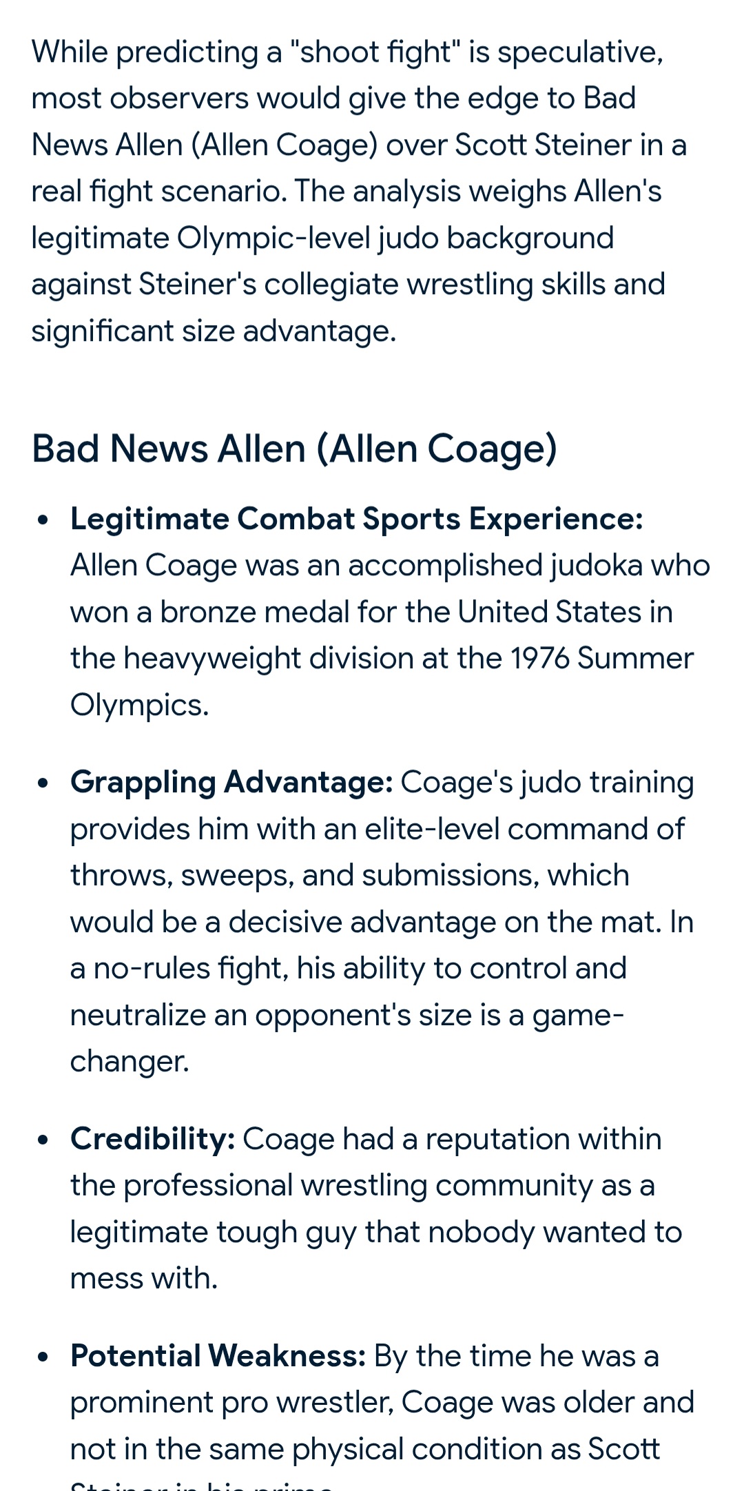 Idk about that bad news brown was just as big probably bigger. Only way I see steiner winning is wrestling rules. Judo actually makes allen better and more deadly in a street fight since these guys have to train to fall a certain way just to avoid getting conclusions from their oppoenents.