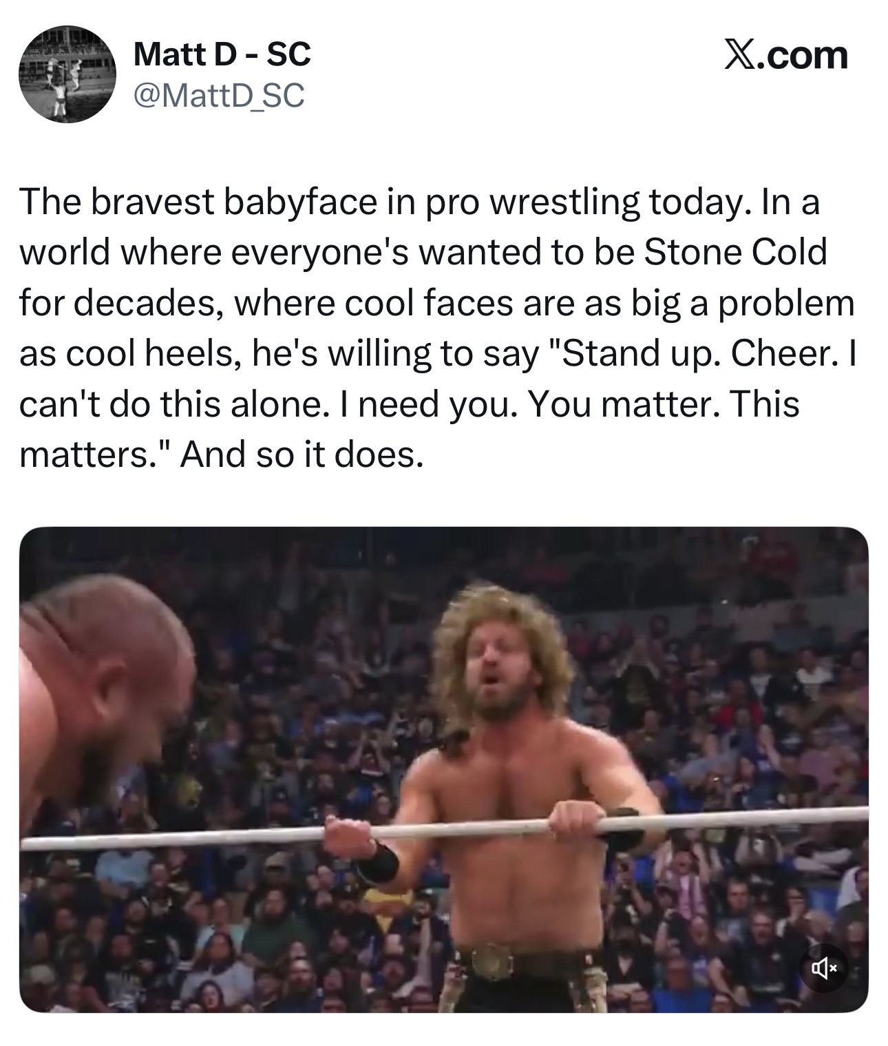 >>19114179>Cool facesAren't face supposed to be cool? I get how an AEW fan might be lost thereAlso him having to beg the crowd for a reaction isn't the flex this retard thinks it is