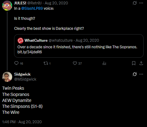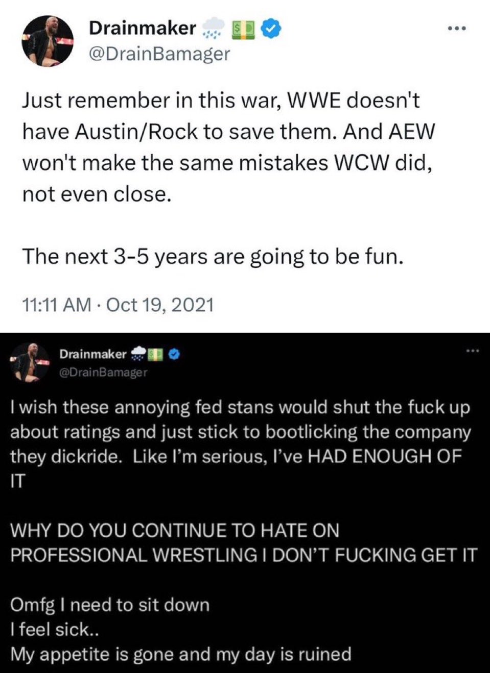 >>19114399>adult cartoon watcher hugbox fanbase that uses wrestling as a friend simulator and as a moral purity testThis is why I hate AEW fans.I don't dislike AEW, but I hate their fans.It's fucking wrestling, an industry built by liars, thieves, cheats, and murderers. There is no "moral" wrestling company but they think AEW is the moral company and think that watching WWE is indicative of your moral character.